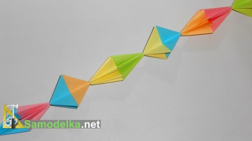 Сделать гирлянду из бумаги очень просто, мы используем технику оригами. Такая бумажная гирлянда легко создается самыми маленькими детьми и будет очень кстати к новогодним праздникам. Мы использовали бумагу 8*8 см.