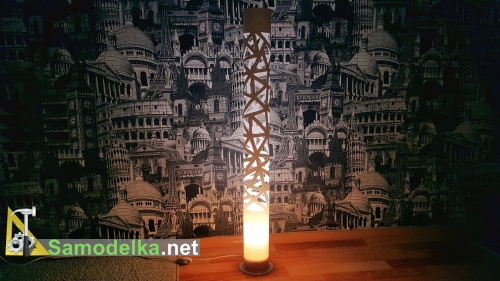 Процесс очень прост. Изолентой наносим рисунок, ненужные места вырезаем гравером, во фланец устанавливаем патрон с лампочкой. Более подробно смотрите на видео: